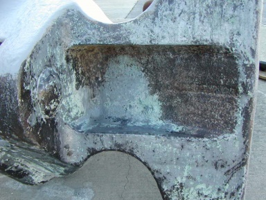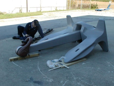 (October 2003) Sailors from the Naval and Marione Corps Reserve Center in Greensboro, North Carolina are currently working on the preservation and presentation of Sampson's anchor for display at the entrance to the Reserve Center. ETC(SW) John P. Dzierzewski and ETC(SS) Darrell Marion drove to Philadelphia on their own time and retrieved the anchor as Sampson was being scrapped. See photographs from the scrapping of Sampson on this site. Seabees from CBMU 202 Det B at the Reserve Center spearheaded the effort for and have prepared the display area foundation for the anchor, a 9' x 9' x 10" deep foundation for the concrete pad, and concrete will be poured the week of October 6, 2003. Several sailors have contributed greatly to the effort to preserve the anchor, including EMC(SW) Brian Kroenung who we thank for all the photographs and BM2 Cramton, both of who worked to add another coat of haze gray to the anchor and this year's CPO selectees: